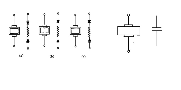 a為正常狀態下的等效電路,其中上、下兩個電容器代表上、下兩個介質層的電容;兩個箭頭表示和N型半導瓷的接觸狀態;中間部分則表示半導體瓷中尚有一定的電阻。 b和c則分別表示兩邊或一邊介質層被損壞後的不正常情況。介質層被損壞的程度不同則二極管的正、反電阻也不同,因此它並不意味著是一個常規的二極管。